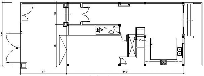 Tầng trệt được thay đổi bằng cách lùi vào để chừa thêm diện tích bên ngoài cho sân đậu xe hơi. Phòng vệ sinh ở ngay giữa nhà được đưa vào dưới chân cầu thang. Phòng khách được bố trí ngay ở tầng trệt nhìn thẳng ra khoảng sân có cây và hồ nước. Lầu 1 có chiều cao đến 3,6m cho cảm giác hơi bị lạc lõng khi sử dụng làm phòng ngủ. Người thiết kế đã xử lý độ cao bằng cách chia không gian làm hai cấp độ. Phía trên cao dành cho nơi làm việc, phòng vệ sinh. Phía thấp dành cho giường ngủ, việc phân chia này đem lại nét khác biệt cho phòng ngủ tạo nên sự thú vị với cảm giác thay đổi. Lầu 2, cầu thang được xoay vế để tăng diện tích cho phòng giải trí.