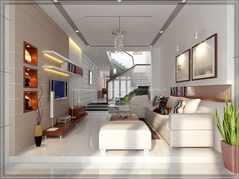 Bên cạnh đó, việc sử dụng những chiếc tủ đựng ti vi, bộ ghế sofa màu trắng nhẹ nhàng, hay màu kem nền nã, màu be nhã nhặn cũng giúp cho căn phòng khách sáng bừng và tươi mới.