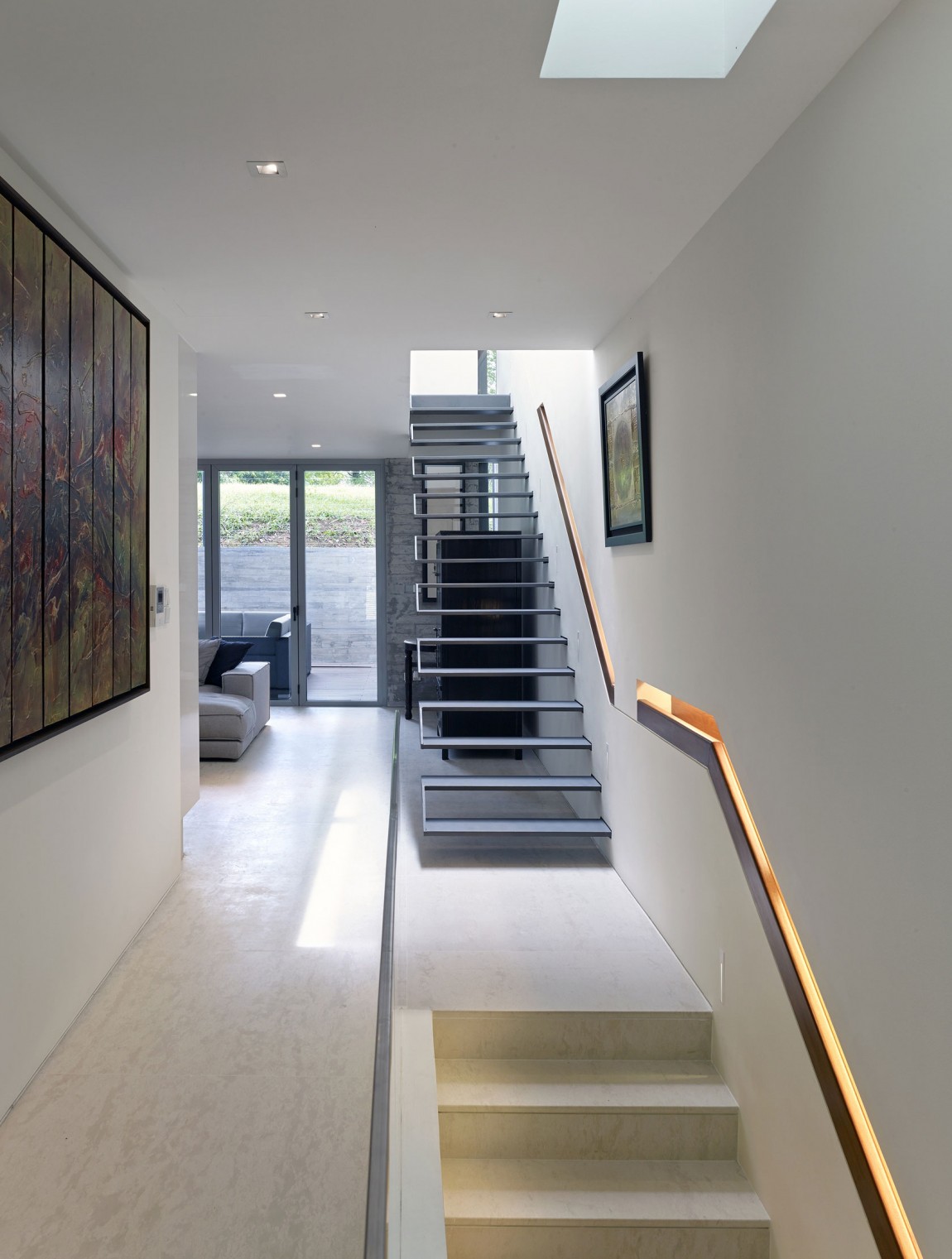 Hướng nhìn ra đường phố từ phía trước nhà ít “rõ ràng” hơn nhìn từ phía sau, trong khi cửa sổ được gắn bằng loại cửa chớp giúp ngăn cách không gian riêng tư của gia chủ. Tầng trệt của ngôi nhà là nhà bếp, phòng ăn, phòng nghiên cứu và một phòng sinh hoạt chung. Một phòng khách rộng rãi và các phòng riêng của trẻ em nằm ở tầng hai. Phòng ngủ nằm ở tầng trên cùng và kèm theo một sân thượng riêng với tầm nhìn bao quát toàn cảnh sườn đồi và các khu vực xung quanh.
