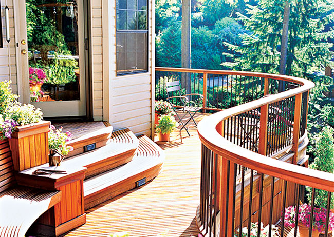 Từ lan can vòng cung, cái hoạ tiết uốn lượn đến sàn bo góc mềm mại, tất cả đều có thể uyển chuyển để hoà mình vào thiên nhiên, và trên hết là góp phần làm tăng nét độc đáo bắt mắt cho khu vực sinh hoạt ngoài trời của bạn. Bên cạnh đó bạn cũng cần phải chú trọng việc liên kết các mối nối và lựa chọn vật liệu phù hợp cho các khu vực chịu uốn cong. Gỗ tuyết tùng tây còn non là một sự lựa chọn tốt bởi tính mềm dẻo, màu sắc ấm áp, và khả năng chịu đựng thời tiết ngoài trời khá cao.