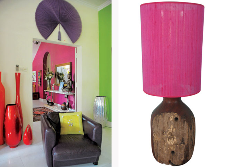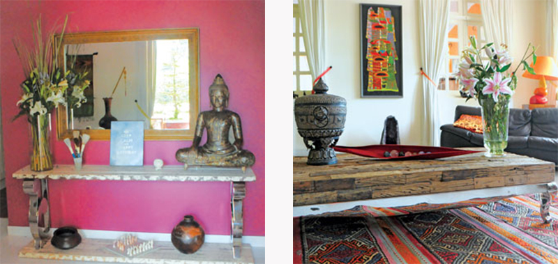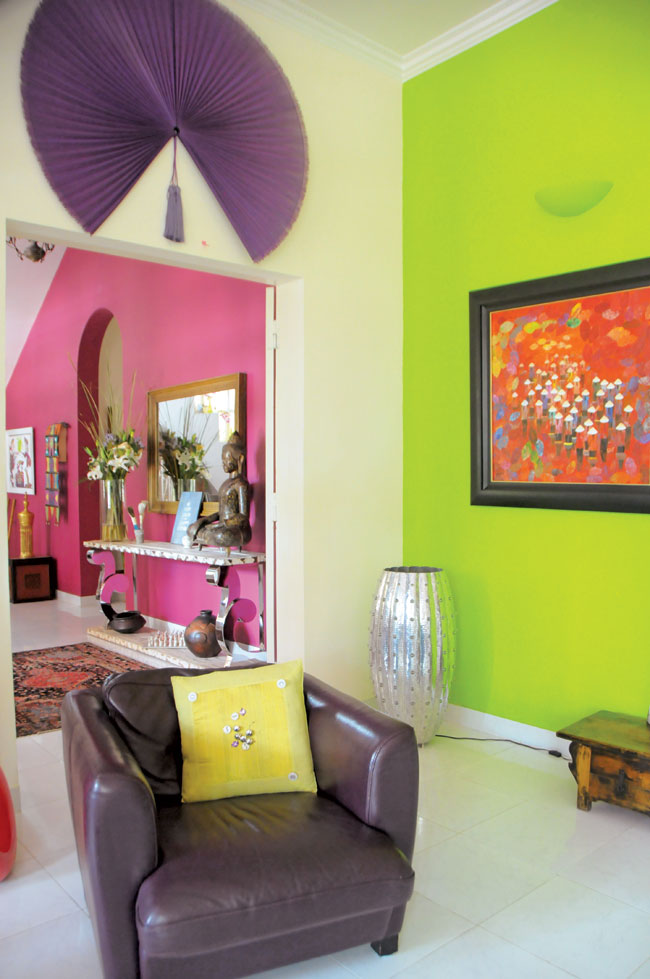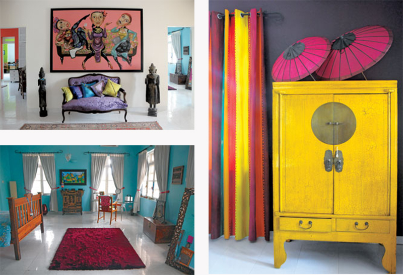 Đồ trang trí được họ mua từ nhiều nơi trên thế giới với màu sắc nhất quán trong phạm vi đỏ, cam, vàng. Chiếc tủ sơn mài Trung Quốc màu vàng mua từ Singapore đặt gần bức tường màu tím. Tác phẩm điêu khắc do các nghệ sĩ trong gia đình thực hiện, tranh treo tường của Hunterwasser, một hoạ sĩ sáng tạo người Áo đầu thế kỷ 21.