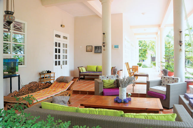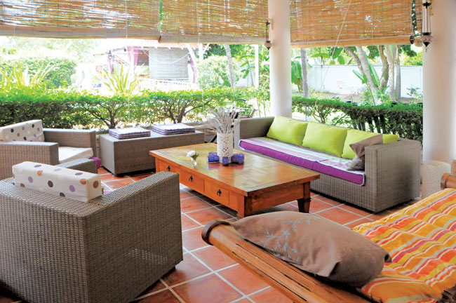 Bên ngoài, nữ chủ nhân ngôi biệt thự đã tạo ra một sân hiên (terrace) vui nhộn, đầy nét nhiệt đới, với các ghế sofa mây, ghế đá, ghế gỗ. Quả là một bầu không khí thích hợp để thư giãn.