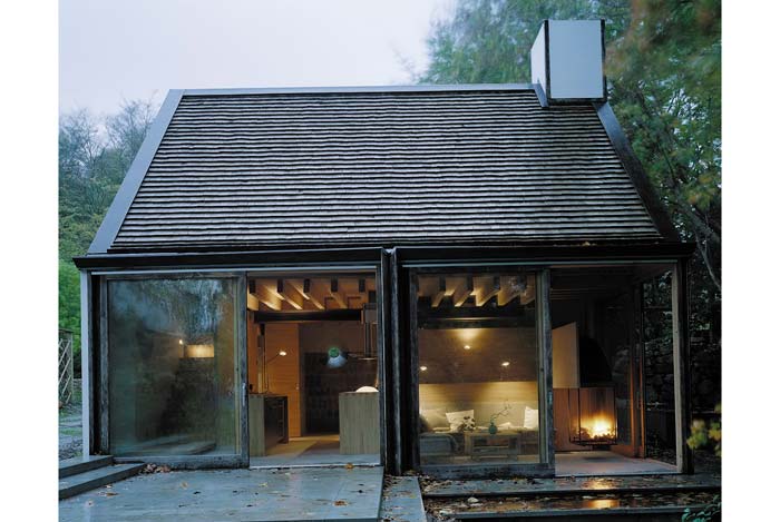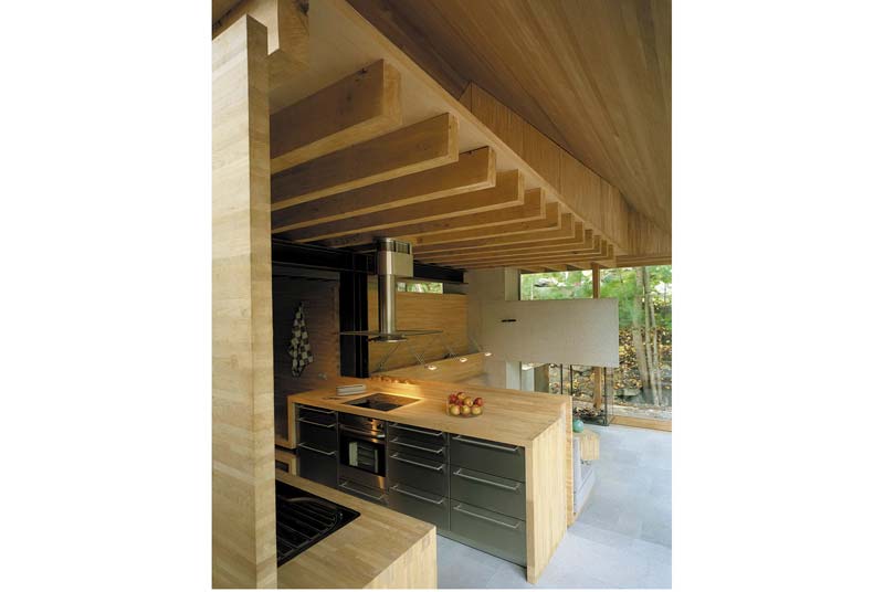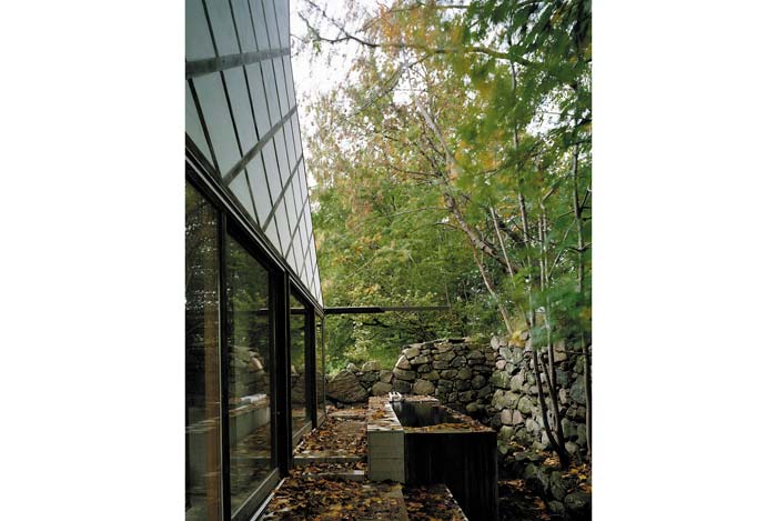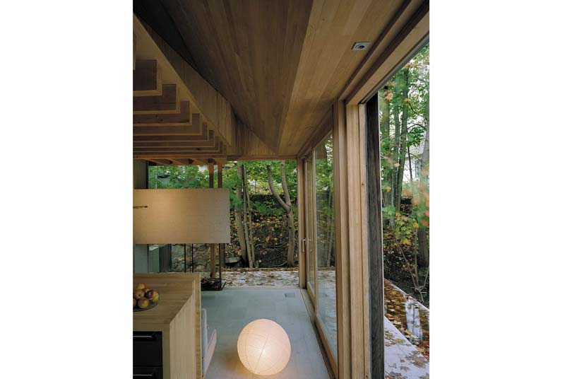 Trước cửa nhà có một mặt nước. Các cửa kính trong nhà đều có thể mở to hết cỡ để tiếp xúc với thiên nhiên càng nhiều càng tốt (vào mùa ấm), gia chủ có cảm giác đang cuộn mình giữa ổ thiên nhiên.