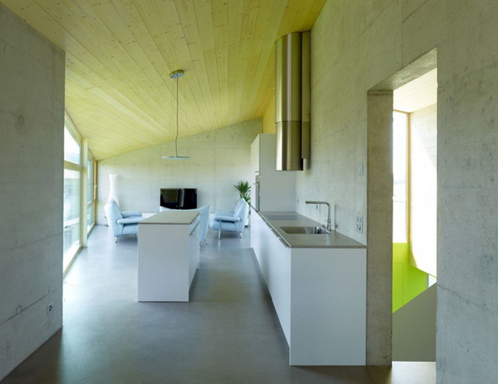 Ngôi nhà được xây bằng bê tông bên trong và bên ngoài được phủ lớp cách nhiệt màu xám tro. Khung cửa sổ khung làm từ nhôm và rèm cửa mang màu xám nhạt. Bề mặt cầu thang bên trong ngôi nhà được phủ nhôm. Lối vào được đánh dấu bởi một chỗ trũng trên một bề mặt có màu sắc có thể thay đổi. Hai nguyên liệu chính đặc trưng bên trong của ngôi nhà chính là bê tông được đánh bóng cho sàn nhà và các tấm ván gỗ cho trần nhà.
