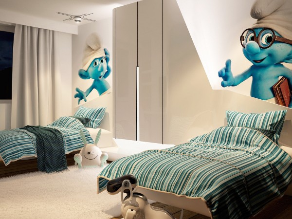 Không phải tất cả các thiết kế tương lai đều phải hòa hợp với nhu cầu sử dụng trong gia đình – nhưng kiểu thiết kế này đã mang mục đích như vậy. Với cách trang trí thêm decal nhân vật Xì Trum trong bộ phim hoạt hình Xì Trum (The Smurfs), căn phòng dành cho trẻ em này vừa mang phong cách độc đáo với đầy màu sắc nhưng vẫn thể hiện sự vui tươi và phù hợp với kiến trúc tổng thể của ngôi nhà.