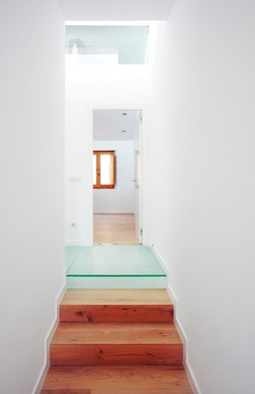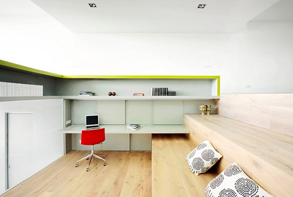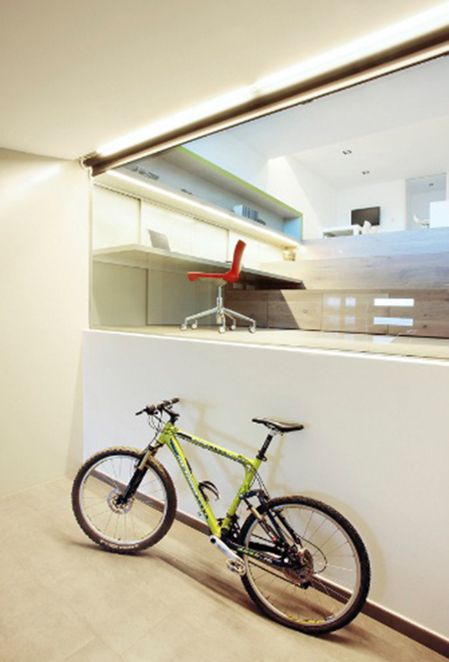 Phần trung tâm của tầng trệt được đặt thêm một tầng lửng cho phép chủ nhà có thể quan sát được phòng khách từ phía tầng hầm.