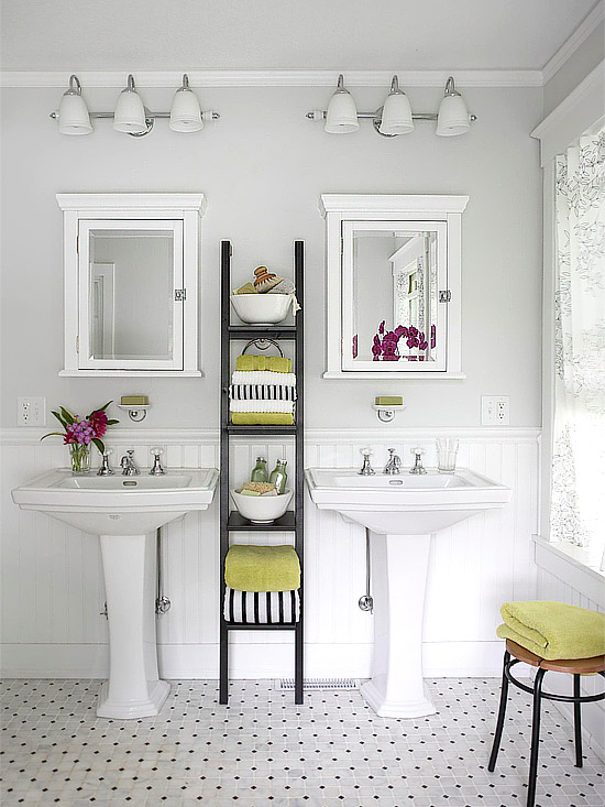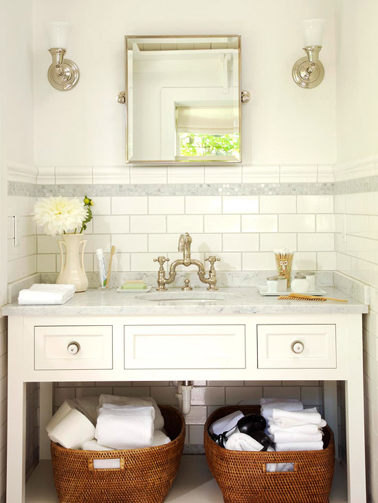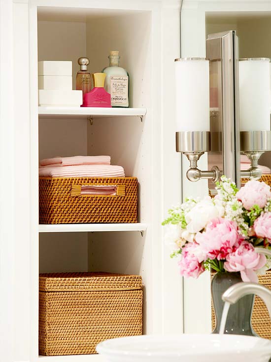 Khoảng tường trống bên trái của bồn rửa cũng có thể được tận dụng để tạo một kệ lưu trữ theo chiều dọc. Ngăn phía trên dùng để đặt nước hoa và tinh dầu, trong khi các giỏ bên dưới thì giữ cho những chiếc khăn tắm được gọn gàng. Nếu bạn định mua giỏ hoặc thùng để đựng đồ thì bạn cần đo kích thước không gian lưu trữ trước nhằm đảm bảo chúng vừa vặn với nhau.