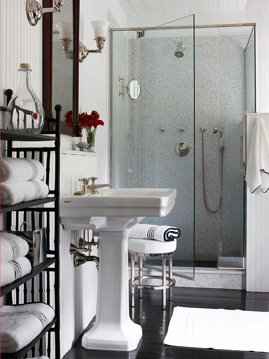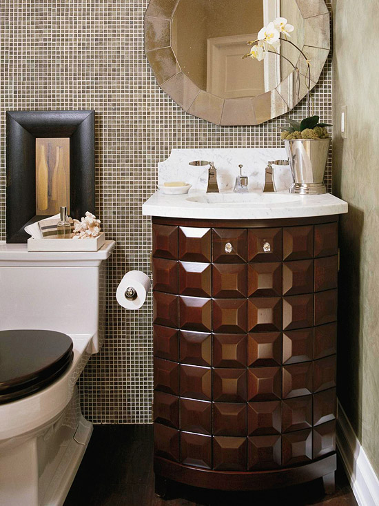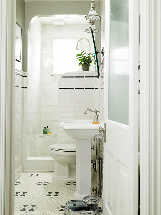 Nếu bạn muốn thiết kế một phòng tắm nhỏ sang trọng, bạn nên xem xét kỹ yếu tố màu sắc và kích thước của gạch. Màu sắc tươi sáng, gạch lát sàn và ốp tường có kích thước lớn có ý nghĩa quan trọng giúp phòng tắm trông rộng hơn. Trong khi đó màu sắc đậm tạo ra cảm giác chật chội. Một điều quan trọng nữa là ánh sáng đèn. Đèn có thể trực tiếp làm không gian lớn hơn hoặc ít nhất nó có thể tạo cảm giác về một không gian lớn hơn.