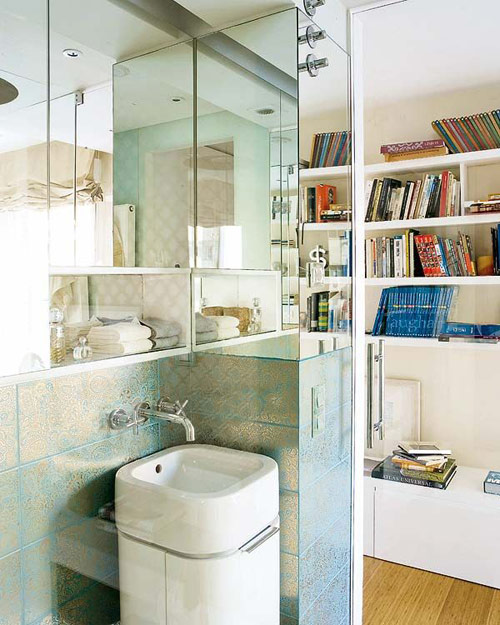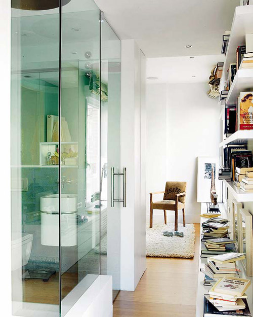 Phòng tắm kính trong suốt táo bạo nằm khuất bên trong phòng ngủ. Bức tường đối diện được tận dụng để lắp hệ thống kệ mở lưu trữ sách, tạp chí và đồ dùng cần thiết.