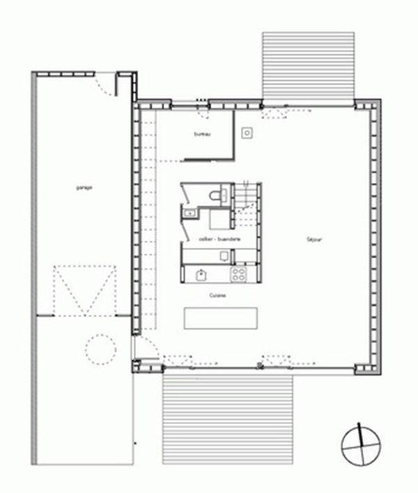 Mặt tiền nhà hướng về phía Nam và phần lớn được lắp kính nhằm tăng năng lượng mặt trời cho ngôi nhà. Lớp kính này có lớp bảo vệ để kiểm soát ánh nắng mặt trời theo từng mùa. Tầng trên được thiết kế gợi mở ra phía Đông và Nam, trong khi phía Bắc thì đóng kín còn phía Tây chỉ chừa những kẻ hở nhỏ cho khu vệ sinh và nhà tắm.