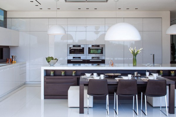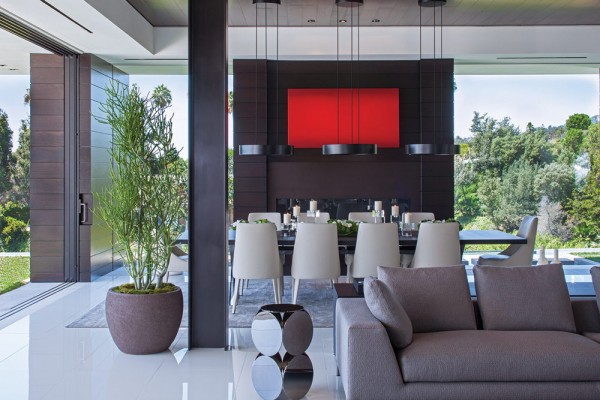 Phòng khách, phòng ăn và bếp được xây dựng hợp lý nhằm tận dụng lợi thế về tầm nhìn tuyệt vời ra khung cảnh bên ngoài. Ngoài ra, nội thất bên trong gồm tủ sơn mài tuyệt vời từ Ý và các thiết bị ứng dụng đầy nghệ thuật cũng giúp tăng thêm sự sang trọng cho ngôi nhà.