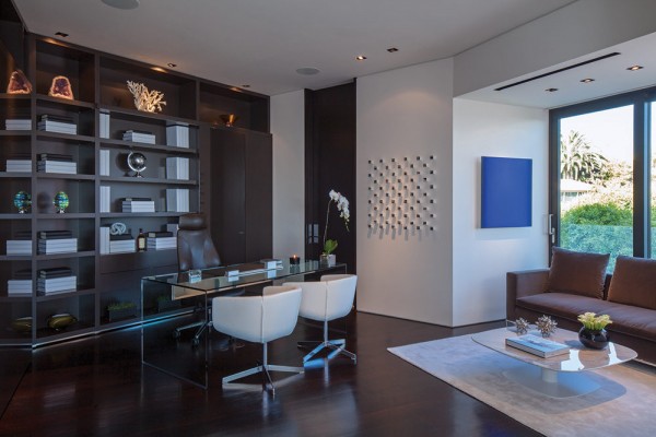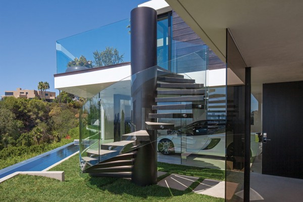 Phòng cho khách riêng biệt được nối bằng cầu thang xoắn ốc với khung kính bao quanh. Biệt thự còn có phòng nghiên cứu và phòng tập thể dục gồm một bar nhỏ bên trong.