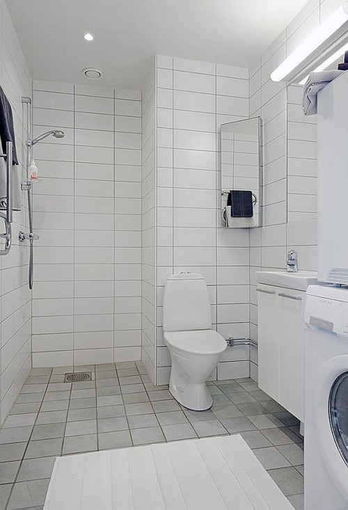 Phòng tắm khá rộng rãi, thoải mái đủ chỗ đặt thêm máy giặt. Nội thất tối giản, chậu rửa mặt nhỏ gọn đủ dùng, kết hợp thêm tủ đồ bên dưới để cất các vật dụng cần thiết trong phòng tắm.