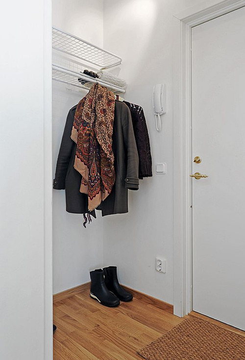 Ngay sát cửa ra vào có lắp hệ thống kệ mở và giá treo đồ gọn gàng.