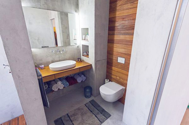 Khu vực bồn tắm bên trong cũng được thiết kế độ cao tầng khác nhau – một cách phân định ranh giới đơn giản mà hiệu quả. Sàn nhà ốp gỗ đảm bảo sự sạch sẽ cho không gian sử dụng nhiều nước như phòng tắm.