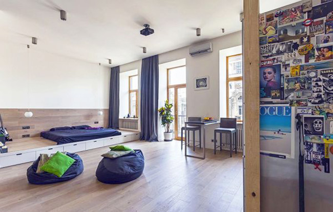 Căn hộ này nằm ở thành phố Kiev, Ukraine. Nó là một căn hộ dạng studio (Studio là từ dùng cho các căn hộ loại nhỏ, không phân chia không gian, với diện tích tối đa chỉ khoảng 58m2) mà ban đầu là một căn hộ 2 phòng. Nó đã được “biến đổi” thành một không gian đáng yêu bởi bàn thay của KTS Dan Vakhramieiev – giám đốc sáng tạo tại FILD.