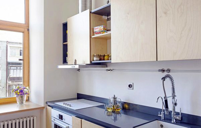 Gian bếp ngăn nắp và rất sáng. Hệ thống tủ bếp trên dưới đơn giản, kết hợp ba gam màu trắng, kem và xanh chủ đạo. Toàn bộ tiện nghi được bố trí theo chiều dọc một cách gọn nhẹ. Ánh sáng tự nhiên chính là điểm mạnh của căn hộ này. Nó khiến cho không gian bên trong tươi sáng hơn, xòa nhòa cảm giác chật hẹp của một căn hộ nhỏ.