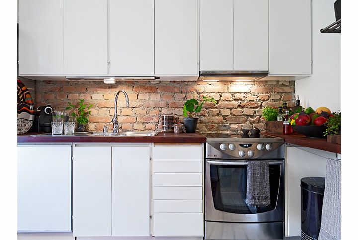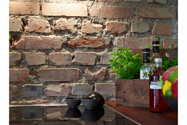 Trong bếp, bức tường với mảng gạch trần cho cảm giác ấm áp, “có hơi người”…