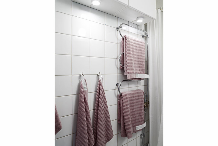 Đây nữa: đã mất công làm điệu thì trong nhà tắm, khăn tắm, khăn mặt nên đồng chất, đồng màu như thế này chẳng hạn, đừng có hổ lốn khăn thì cái hình con mèo, cái thì hình pokemon, cái lại hoa xanh đỏ, sọc ngang dọc…