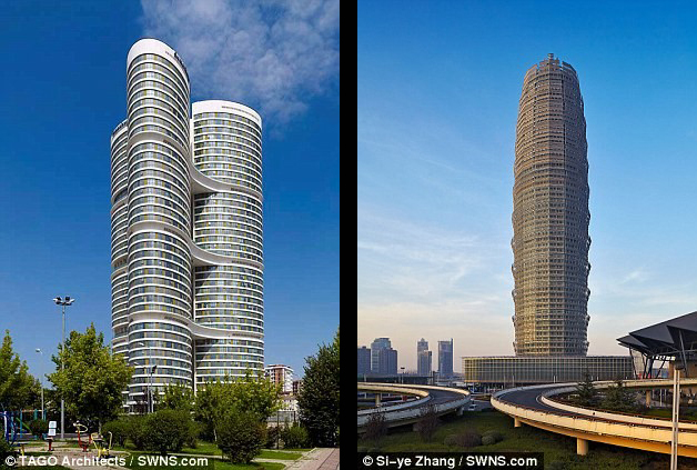 Ảnh trái: Đồng hạng 9 có tòa nhà Dumankaya Ikon ở Istanbul, Thổ Nhĩ Kỳ. Tòa nhà bao gồm 3 tòa tháp hình elip được kết nối với nhau. Tòa tháp khổng lồ này có 1.022 căn hộ, 37 khu văn phòng và một trung tâm mua sắm.