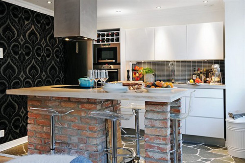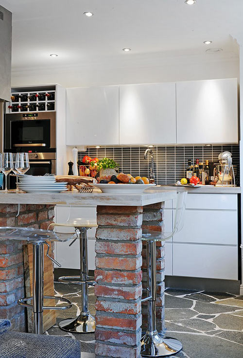 Ví dụ như đảo bếp/quầy bar được thiết kế rất thú vị. Phần thân chính được làm bằng gạch trần. Thoạt nhìn có thể nghĩ nó chưa được hoàn thiện nhưng chính nét thô mộc đấy lại tạo nên cá tính cho không gian sinh hoạt chung này.