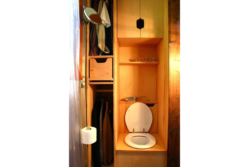 Toilet rất gọn gàng, bên cạnh lại có cái tủ con để đựng đồ. Toàn bộ bằng gỗ tuyết tùng. Chống thấm rất tốt.