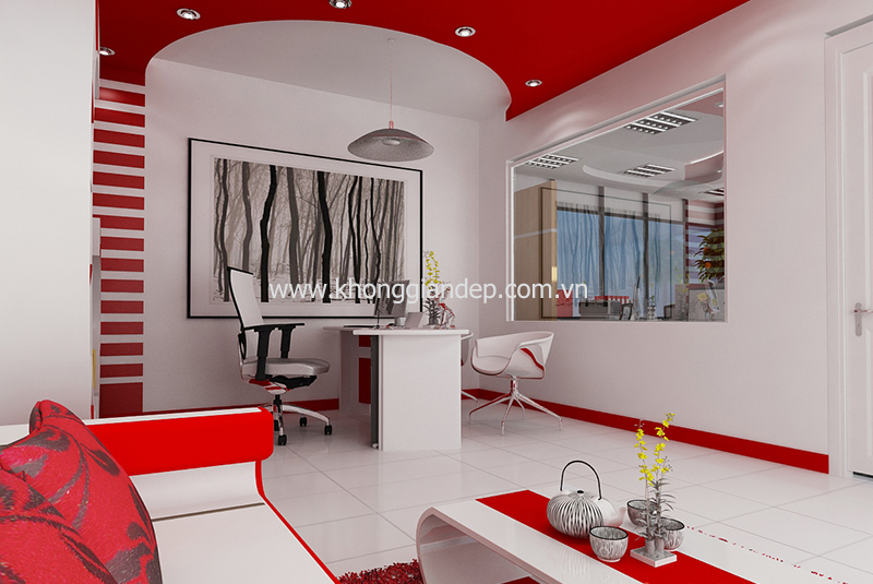 Trần và tường nhà của văn phòng quét sơn màu trắng là rất tốt. Tiếp đến, bạn chỉ cần trang trí bằng màu đỏ, màu xanh lá cây và xanh dương cho phù hợp với các hướng của la bàn là được (chụp nhà tường trắng).