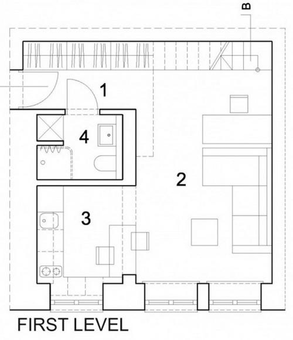 Như bất kỳ căn nhà nhỏ nào, chìa khóa cho giải pháp diện tích là sử dụng không gian theo chiều dọc. Theo đó, các nhà thiết kế tạo ra một tầng thứ hai tạm thời để giải phóng diện tích sàn.