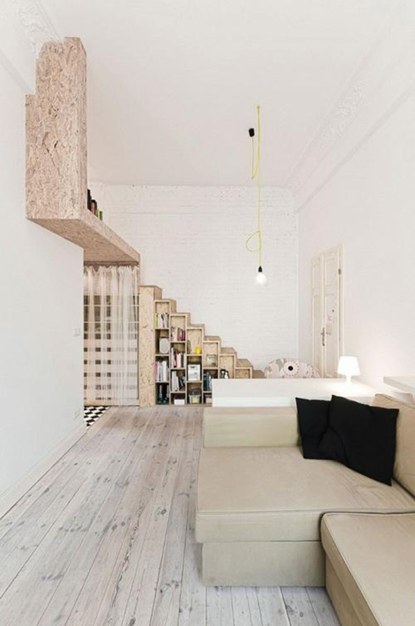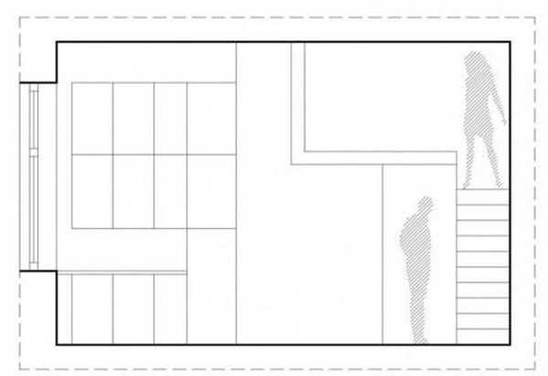 Một phòng ngủ vì thế đã được thiết kế “treo” trên trần nhà, kết nối với nó là chiếc cầu thang hẹp, tiện ích với một hệ thống tủ kệ “đo ni đóng giày” bên dưới có thể chứa hàng núi vật dụng cũng như các “bộ sưu tập” yêu thích.