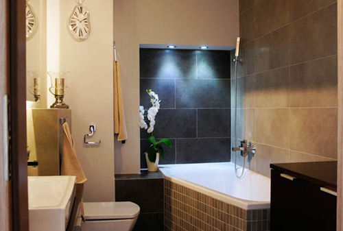 Ánh đèn vàng trầm ấm cân bằng lại màu tối của gạch lát sàn và gạch ốp tường.