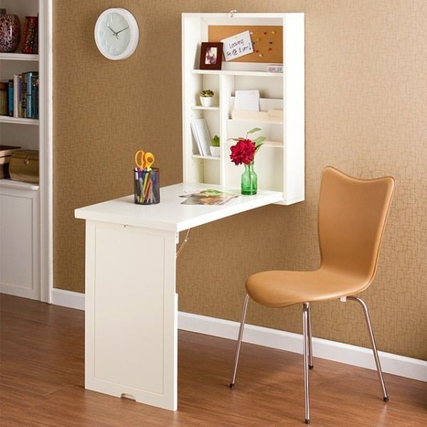 Một vấn đề nan giải thường gặp của những ngôi nhà nhỏ là không có không gian cho bàn làm việc. Trong những trường hợp này nhiều người thường phải sử dụng bàn tiếp khách hoặc bàn ăn để làm bàn làm việc một cách bất đắc dĩ. Dạng bàn làm việc ốp tường này sẽ là giải pháp cho bạn. Nó dày chưa tới một gang tay với phần mặt bàn, chân bàn có thể gấp gọn khi không cần sử dụng. Chiếc bàn này còn có thêm những ngăn lưu trữ nhỏ vô cùng tiện dụng.