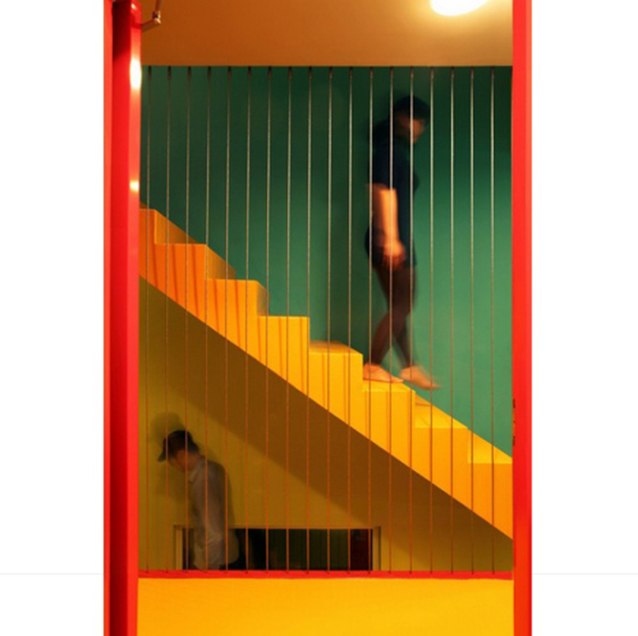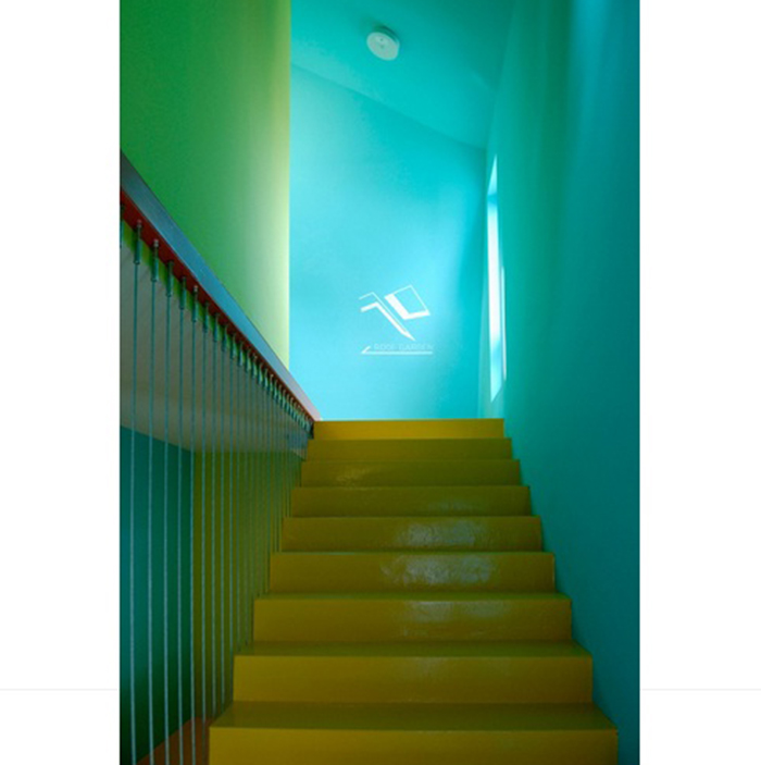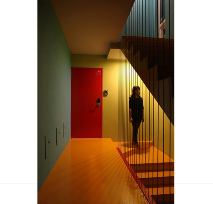 Từ mặt tiền màu trắng ở bên trái, một không gian đầy màu sắc rực rỡ được mở ra sau cánh cửa màu đỏ. Đi bộ từ lối vào tòa nhà đến cửa của mỗi căn hộ, mọi người sẽ bất ngờ với từng ngóc ngách của tòa nhà, chẳng hạn như cầu thang vàng nổi bật trên bức tường xanh.