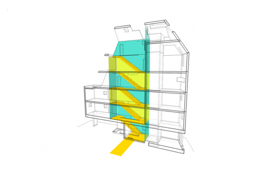 Mỗi căn hộ được thiết kế với mặt bằng đơn giản nhất có thể để không một người nào từ các nhà khác xâm nhập vào khu vực chật hẹp này. Bên cạnh đó, với chút ít chỗ trống còn sót lại, các nhà thiết kế đã khéo léo chuyển thành “không gian thở” như sân thượng và khu vực sinh hoạt công cộng ở trên mái.