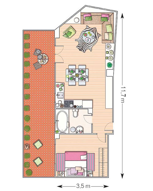 Khu vực sinh hoạt và nhà bếp được ngăn cách bởi đường chéo phòng, bao gồm cả việc bố trí hình chữ L của đồ nội thất. Ở trung tâm hình học là một bàn ăn. Nó tạo thành một khu vực ăn uống rất thoải mái.