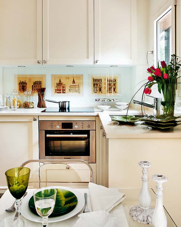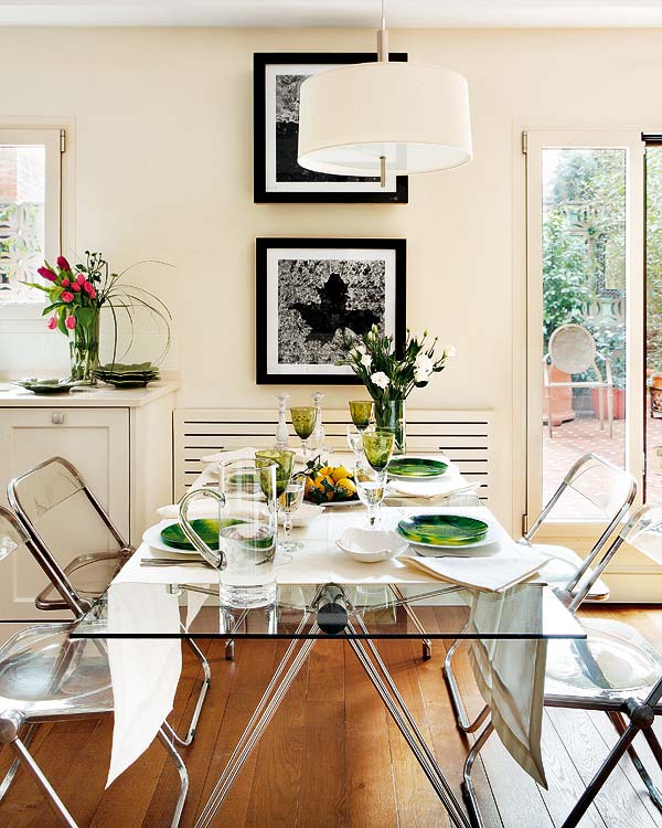 Lựa chọn nội thất bàn ăn bằng kính (bàn ăn và ghế tựa) là một giải pháp thông minh, hoàn hảo. Chất liệu trong suốt cho phép ánh sáng xuyên thấu khiến cho thị giác không bị cản trở giúp cho không gian trải dài xuyên suốt.