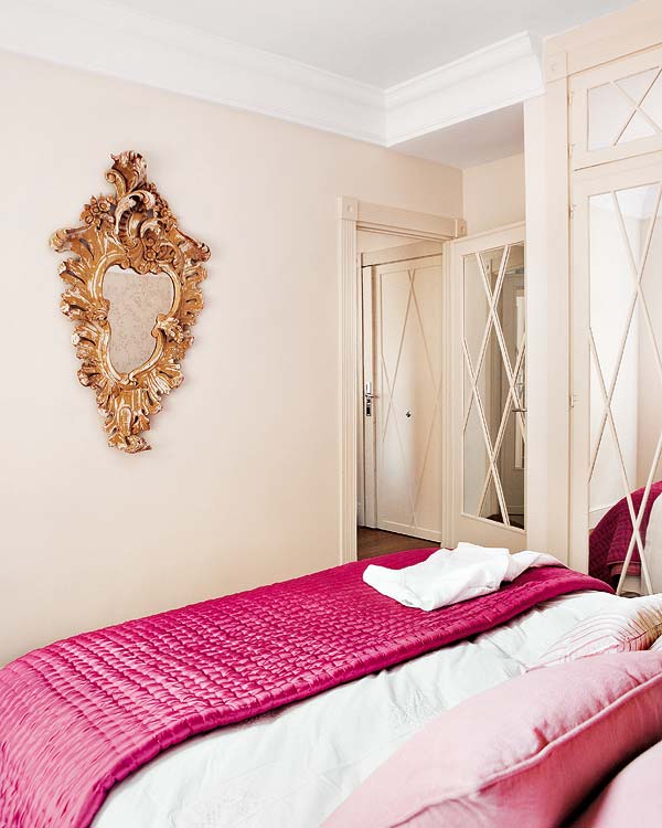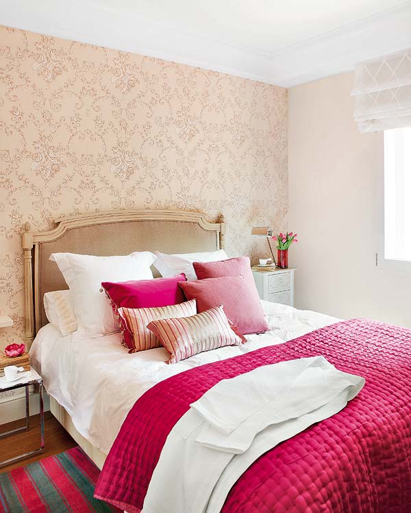 Phòng ngủ ngọt ngào, nữ tính với tông hồng chủ đạo. Sự pha trộn của cặp đôi hồng – trắng trên khung nền trung tính của tường và nội thất tạo cái nhìn hiện đại, tươi trẻ. Việc sử dụng đủ các sắc độ của màu chủ đạo (hồng đậm, hồng phấn, hồng nhạt) rất linh hoạt và sống động.