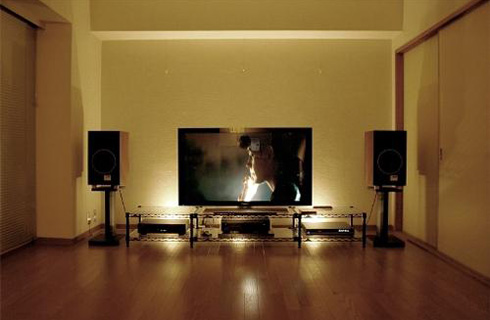 - Gia chủ mệnh Thuỷ: Không gian nghe nhìn mang nhiều nét uốn lượn, vật dụng, thiết bị có tỷ lệ nhiều các màu đen, xám, và xanh biển. Có thể điểm xuyết một số đồ thủy tinh và nhựa, nội thất giao thoa giữa tính thiên nhiên (Thuỷ- Mộc) và tính nhân tạo (Thổ – Kim).