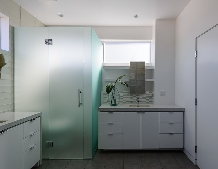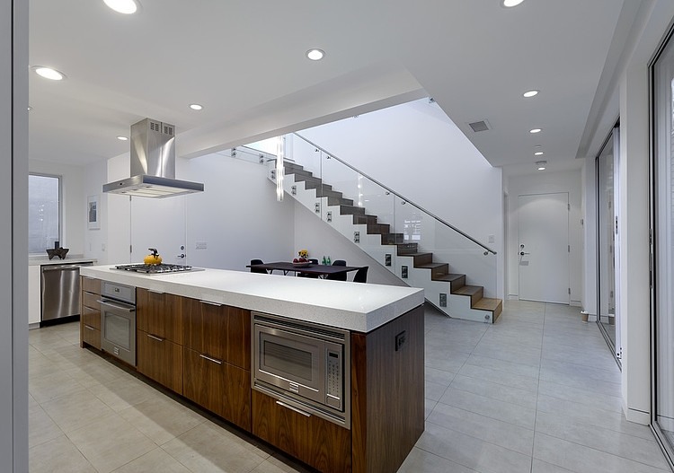 Tất cả các phòng đều được bao bọc bằng những bức tường trắng và được điểm xuyết với vật liệu gỗ, tạo cảm giác của sự chào đón nồng nhiệt. Ngôi nhà cũng được trang trí với hiệu quả thẩm mỹ tinh tế, phá vỡ sự đơn điệu của phong cách tối giản hiện đại. Bên trong nhà, các ngóc ngách đều được soi rọi ánh sáng từ những cửa sổ lớn. Ngoài ra, phòng khách và phòng ăn cũng có thể mở ra ngoài nhờ các cửa kính trượt.