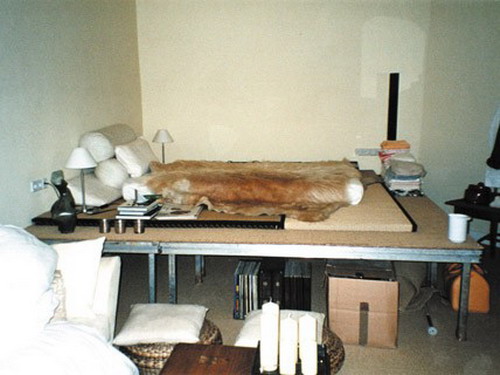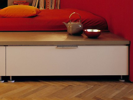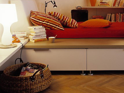 Bên trái đầu giường (hướng tới phòng khách) là một loạt kệ sách và tivi nhỏ. Bên phải là một kệ dài, hẹp phục vụ như một góc có thể thay đồ. Thậm chí có thể kết hợp thêm một vài vật dụng lưu trữ nhỏ để cung cấp thêm khả năng lưu trữ.