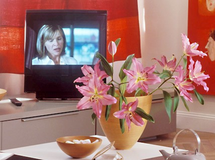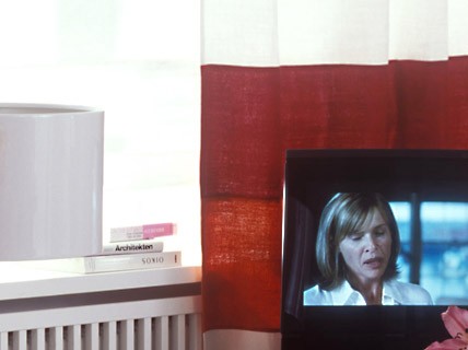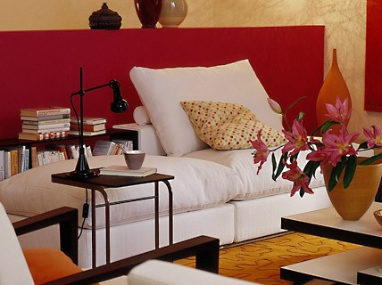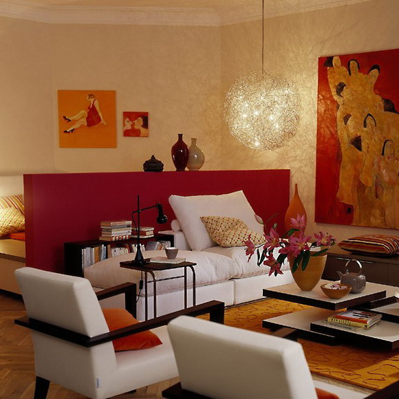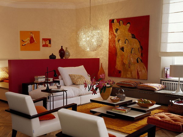 Thảm màu đất son và chiếc bình gốm màu nhạt có cùng giai điệu. Vách ngăn màu anh đào tối (cao khoảng 1.30 cm) ngăn cách khu vực phòng khách và phòng ngủ. Bộ ấm chén phong cách Nhật Bản là hoàn toàn phù hợp với chiếc bàn thấp. Sự hòa quyện giữa hai tông màu đỏ – trắng đã khoác lên phòng khách một vẻ ngoài hiện đại, trẻ trung tươi mới và đầy cảm hứng.