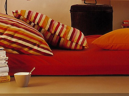 Bộ ga gối màu đỏ tối hình thành từ sự kết hợp của vải lanh và sọc, cộng với các chi tiết hình ảnh trên bức tường và vài chiếc bình nhỏ trên kệ dài là hoàn thiện trang trí cho phòng ngủ đủ chức năng mà phong cách.