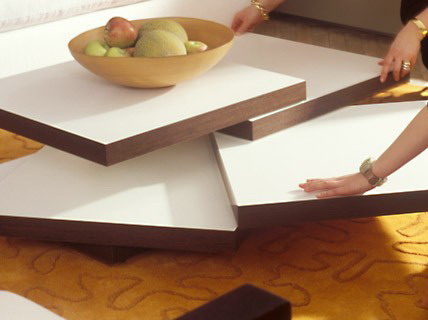 Bàn xoay cánh xòe độc đáo là điểm nhấn thu hút trong phòng khách. Thiết kế đặc biệt, lạ mắt tiết kiệm không gian, khi không sử dụng, nó được thu gọn rất nhỏ nhắn, gọn gàng khi cần đến lại xòe ra đáp ứng nhu cầu trưng bày khá rộng rãi cho không gian sinh hoạt chung. Sự xuất hiện của nội thất thông minh rất tiện ích mà lại tạo cho căn phòng cái nhìn hiện đại.