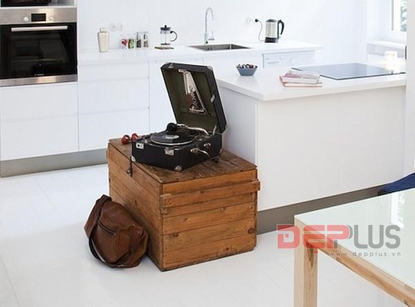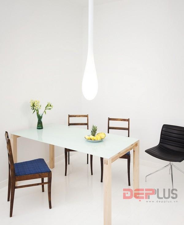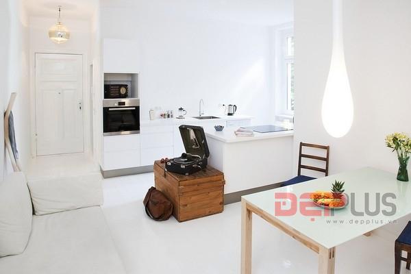 Khu vực nấu ăn và ăn uống cũng được phủ trắng, sử dụng đồ nội thất bằng gỗ nổi bật màu sắc trong căn phòng.