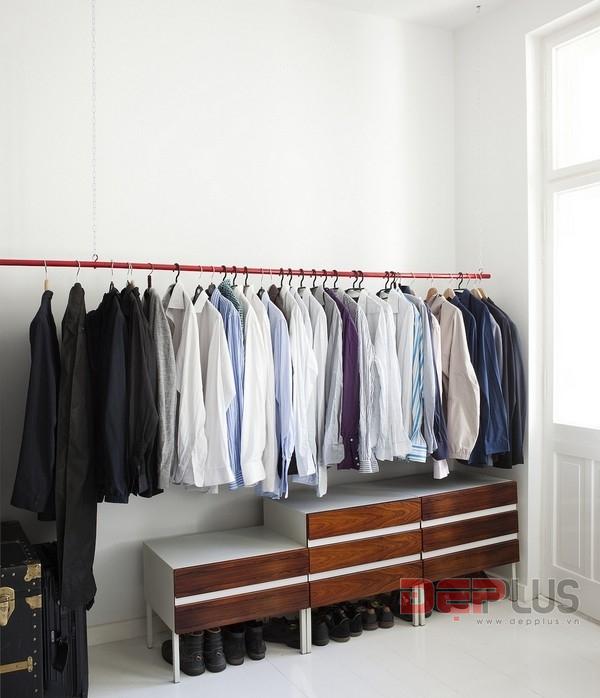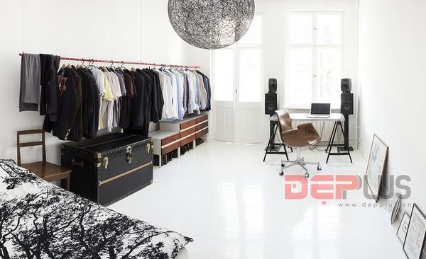 Phòng ngủ kết hợp với khu vực làm việc, do nhà nhỏ nên chủ nhân sử dụng móc treo quần áo và hộp đựng giày mở rộng không gian phòng.