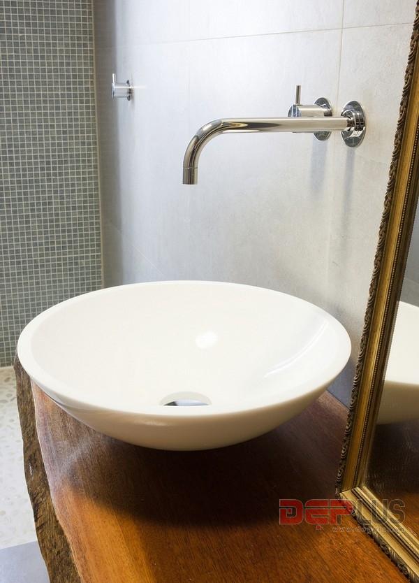 Chủ nhân căn hộ muốn sở hữu một không gian màu trắng trìu tượng với độ tương phản tối thiểu trong các thiết lập cố định. Phòng tắm có thiết kế để mang bầu không khí thư giãn giống như một phòng spa khi sử dụng gạch xám và tường lát đá.