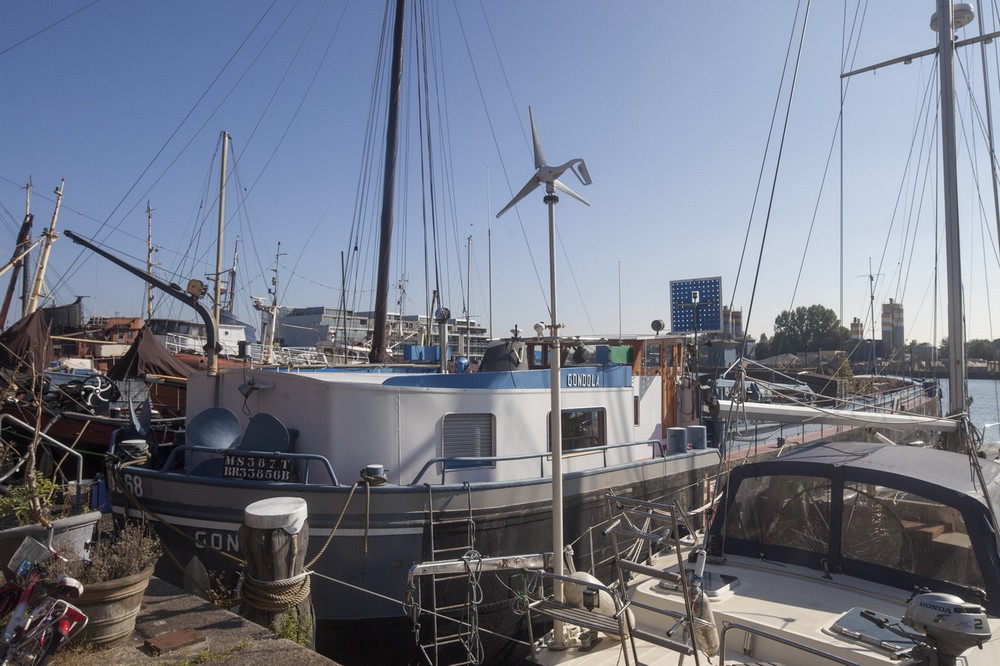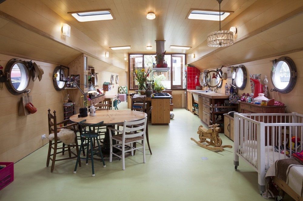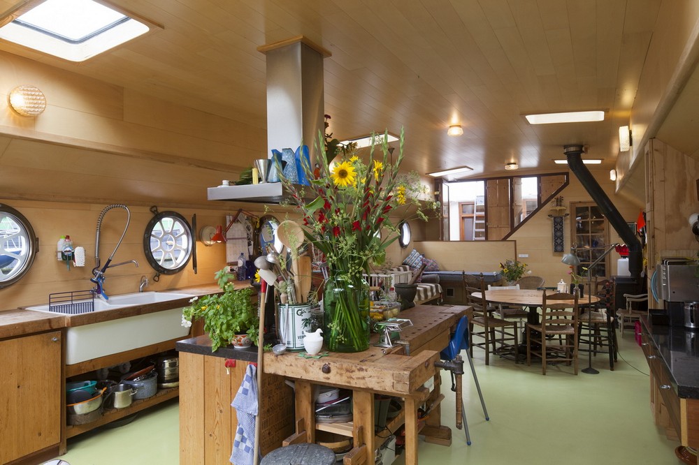 Nội thất bằng thép trong khoang của ngôi nhà thuyền được cách ly bằng 10cm xốp và được bao phủ bởi gỗ dán sáng màu. Sàn bằng xi măng đúc và bên trên là các đường ống. Tấm vách ngăn ngay lối vào đóng vai trò là vách ngăn cho bồn tắm ngoài trời và một cây lê ở cạnh đó. Sự an toàn của trẻ em trên thuyền thường được đặt lên hàng đầu và vách ngăn này cũng là một giải pháp an toàn cho trẻ tha hồ nô đùa mà không sợ bị rơi xuống biển. Cây lê không phải là thứ ta hay thấy phổ biến trên một con thuyền nhưng trọng lượng và kích thước của nó chẳng là gì so với một nhiệm vụ chuyên chở hàng trăm tấn cát, xi măng và đá mà con thuyền từng chở. Sàn ngoại thất cũng đã được phục hồi và hiện đại hóa. Con thuyền bây giờ đã trở thành một căn hộ nhỏ độc lập xinh xắn. (Ảnh: Luuk Kramer ©)