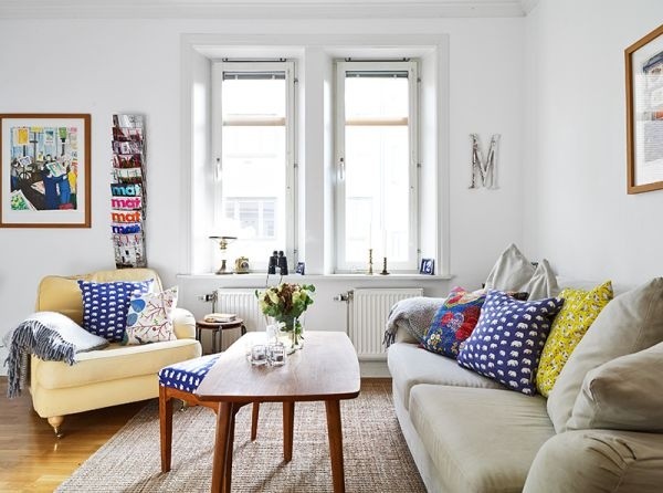 Phòng khách tươi vui với những chiếc gối màu sắc.