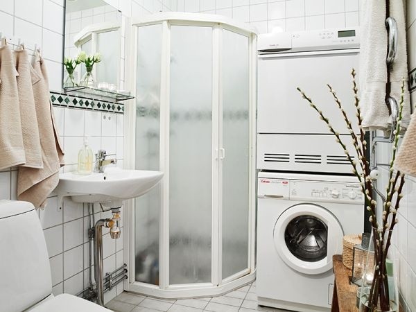 Phòng tắm với bồn tắm đứng riêng biệt khá nhỏ nhắn để chừa chỗ cho máy giặt và máy sấy khô quần áo. Kệ gỗ nhỏ ngoài việc lưu trữ giấy khăn còn có thể đặt bình hoa trang trí.
