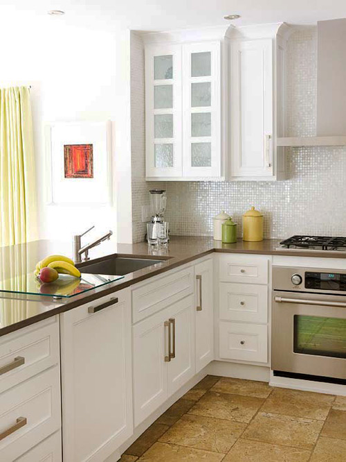 Làm cho một căn bếp nhỏ cảm thấy rộng hơn thực chất là đánh lừa mắt nhìn và bộ não, khiến chúng nghĩ rằng không gian to lớn hơn. Có một cách để làm được điều đó là loại bỏ một vài cánh cửa tủ bếp hoặc thay thế chúng bằng vật liệu kính.