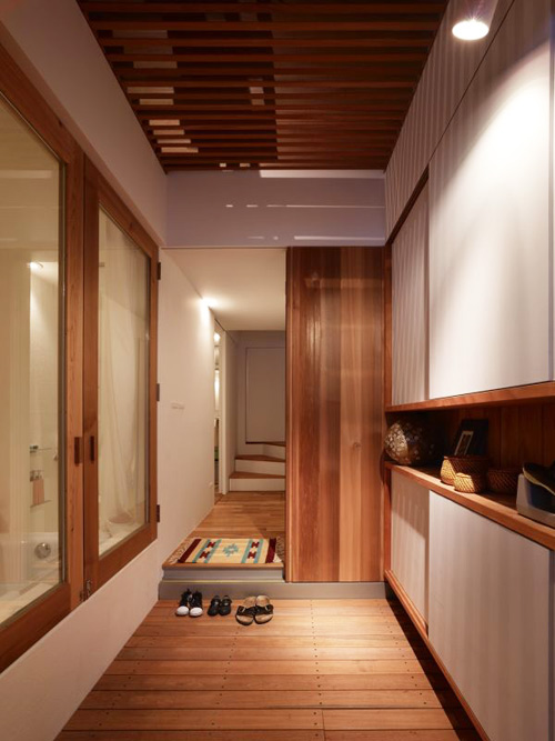 Tầng trệt của ngôi nhà dành làm ga-ra và hành lang. Ở đây được bố trí hệ tủ gỗ nhằm tăng không gian lưu trữ.